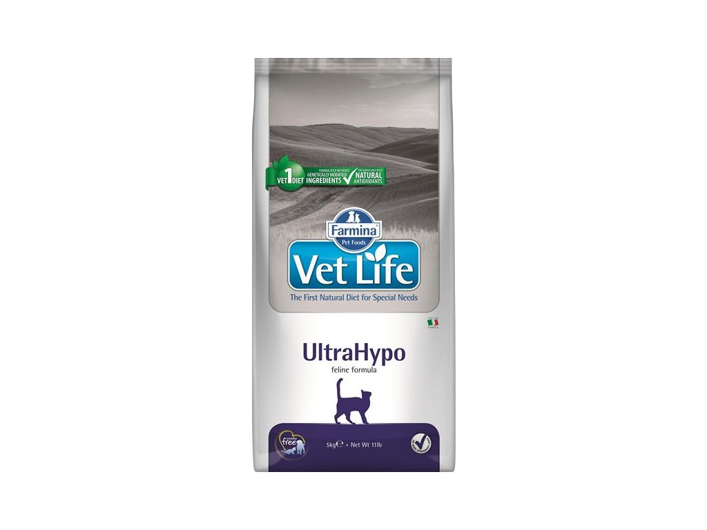 Farmina Vet Life UltraHypo je kompletná veterinárna diéta pre mačky s hydrolizovanou bielkovinou, odporúčaná na manažment pacientov s potravinovou alergiou, potravinovou intoleranciou a tiež na zlepšenie kvality kože a srsti v prípade dermatóz a nadmerného vypadávania srsti. Diéta doporučená aj v prípadoch opakovaného zvracania a chronických zápalových ochorení čriev (IBD).