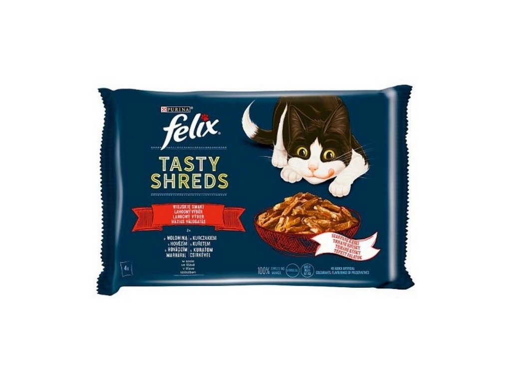 Potešte maškrtný jazýček svojej mačky kapsičkami Felix Tasty Shreds lahodný výber. Kapsičky s trhanými kúskami mäsa v lahodnej šťave nielenže dobre chutia, ale dodajú vášmu maznáčikovi potrebné vitamíny a esenciálne omega-6 mastné kyseliny.