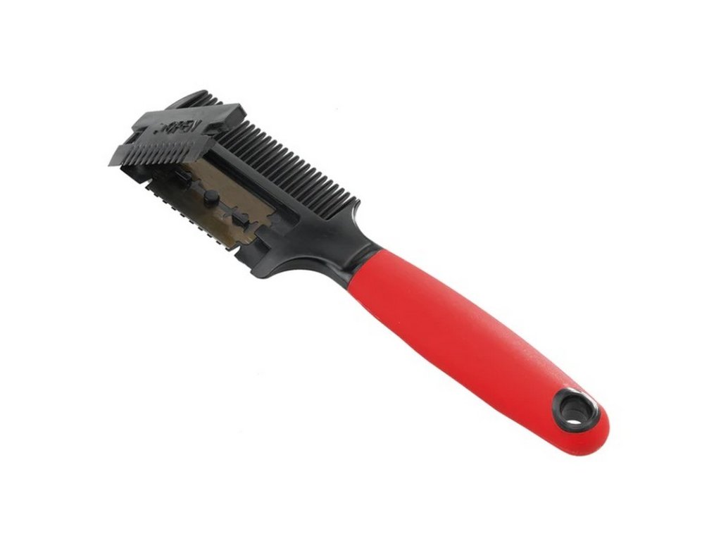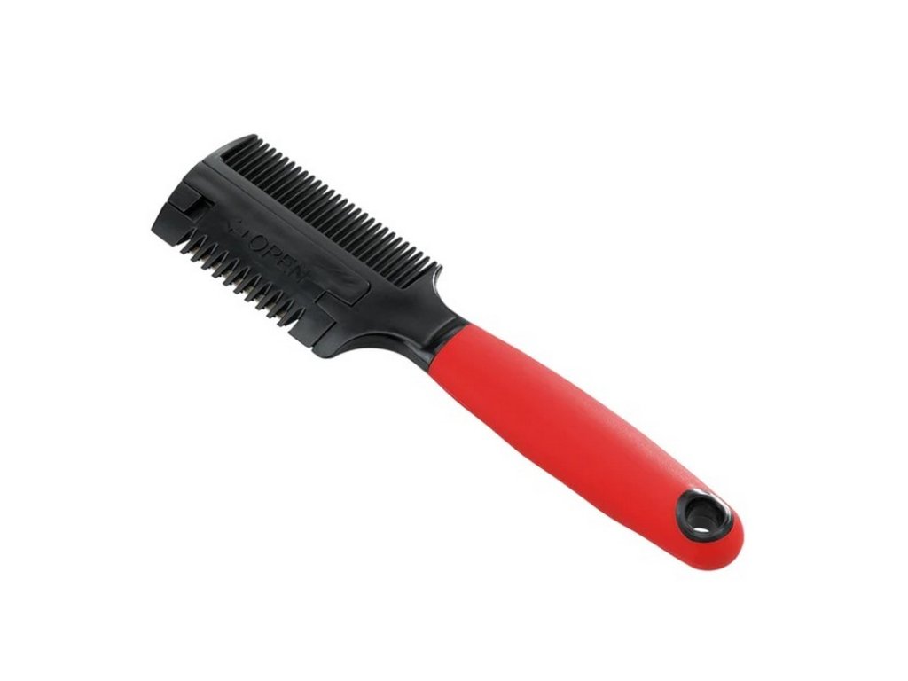 Hrebeň s vymeniteľnou hlavou a protišmykovou rukoväťou, vhodný pre psy, kone aj mačky. Účinne odstraňuje mŕtvu srsť. Nerezový nôž.