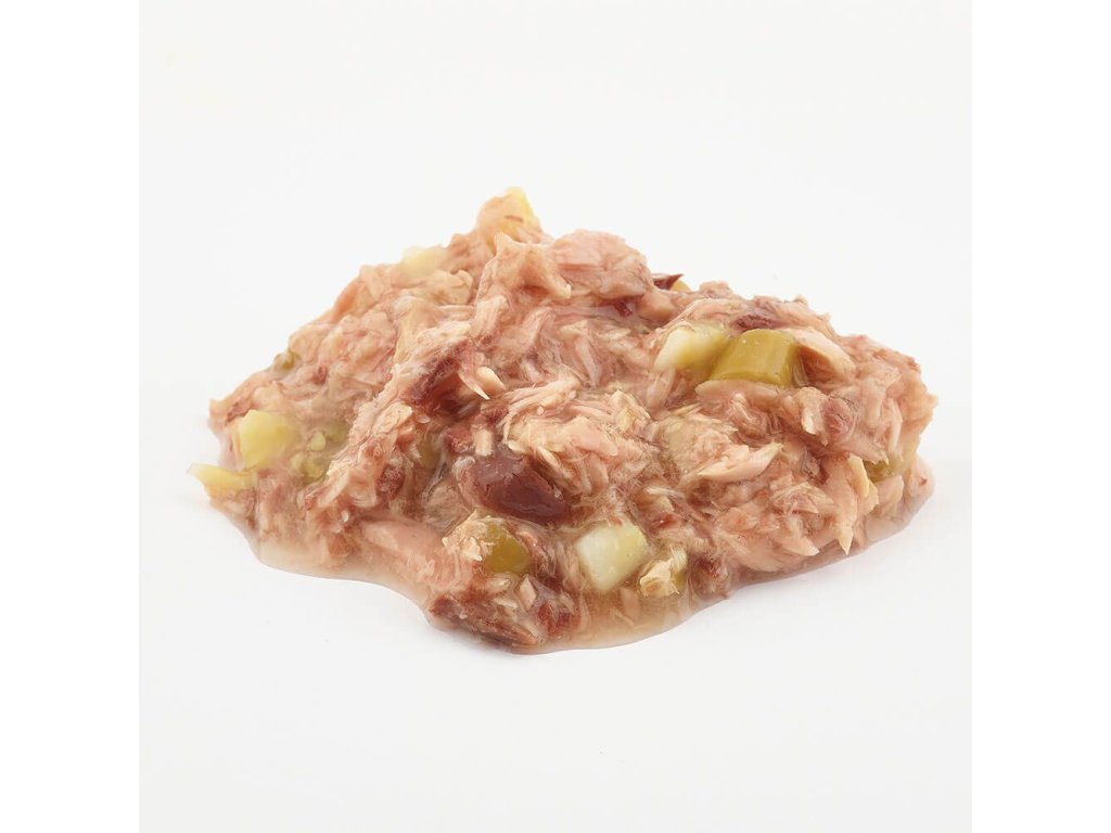 Zloženie: tuniak 50%, zelená fazuľka 8%, sladké zemiaky 8%, tapiokový škrob