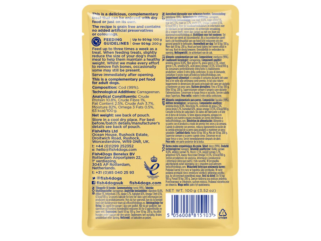 Kapsička pre psov s obsahom tresky je lahodná doplnková pochúťka, ktorá sa môže pridať do suchého jedla, alebo sa môže podávať samostatne. Je vyrobená z lahodnej tresky, bez obilnín, s nízkym obsahom tuku, bez pridaných konzervačných látok a farbív.