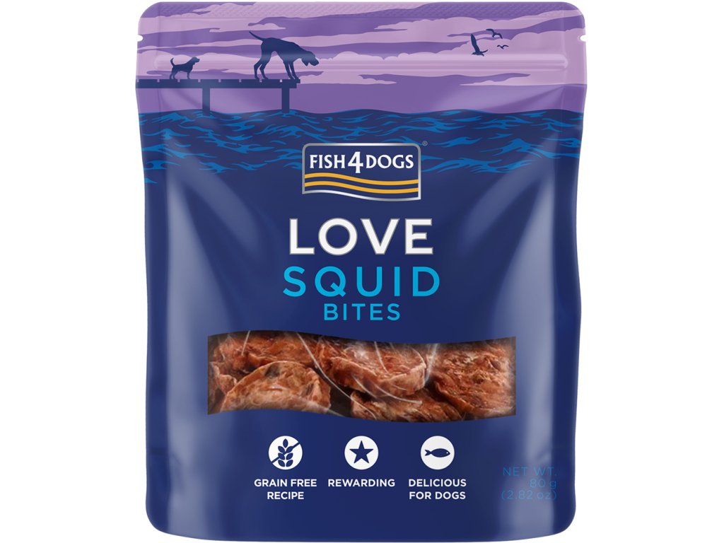 FISH4DOGS Maškrty pre psov LOVE kalmáre 80 g