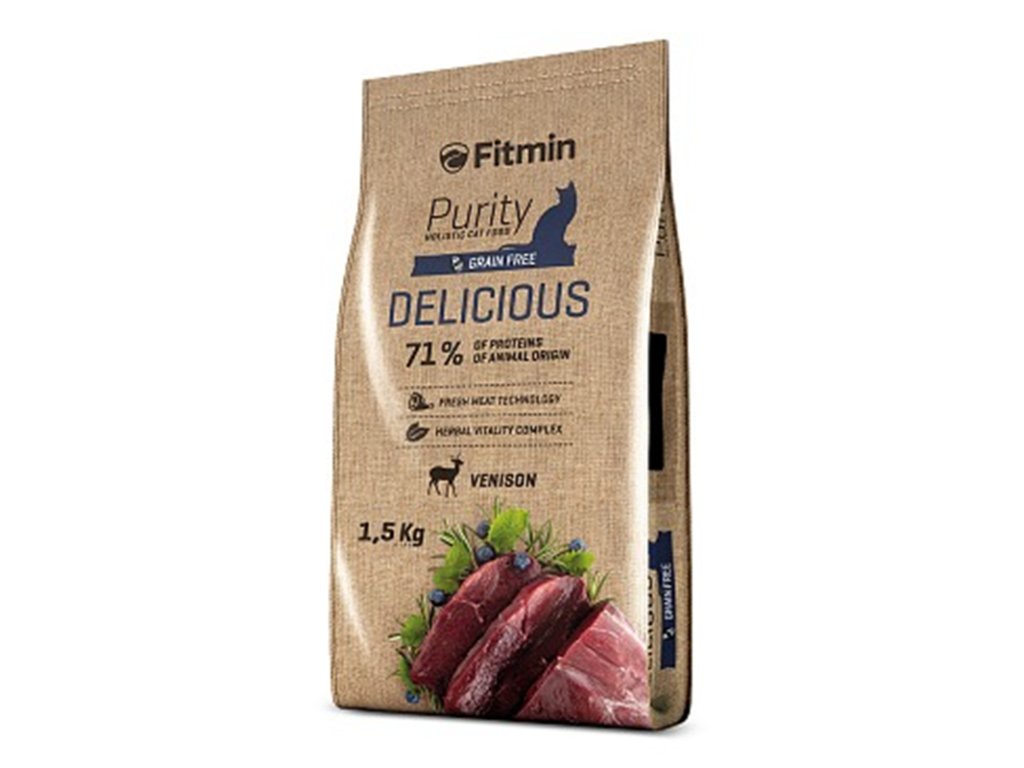 Kulinársky zážitok pre Vašu mačku. To je krmivo Fitmin cat Purity Delicious. Jedná sa o granule pre mačky, v ktorých nájdete bohaté zastúpenie čerstvej zveriny, bylinky na podporu vitality organizmu, ovocie i zeleninu. Nielenže uspokojíte aj tie najmlsnejšie jazýčky Vašich mačiek, ale zároveň im poskytnete prvotriednu kvalitu. Krmivo pre mačky Fitmin cat Purity Delicious je tzv. Grainfree krmivo, to znamená, že neobsahuje obilniny, je bezlepkové a znižuje potencionálne riziko výskytu alergických reakcií (napr. na pšeničný lepok a kukuričný glutén). Krmivo je svojím unikátnym zložením ideálne pre maškrtné mačky, ktorým len tak niečo k chuti nepríde. Vďaka nemu bude Vaša mačka nielen spokojná ale aj vo vynikajúcej kondícii. Granule pre mačky Fitmin cat Purity Delicious obsahujú bylinnú zmes, ktorá má mnoho blahodarných účinkov.