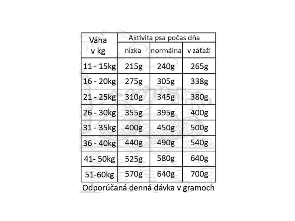 Dávkovanie: viď obrázokPokyny: krmivo Fresh Farm Deer & Rice je kompletné krmivo s obsahom všetkých živín potrebných pre zdravý a dlhý život Vášho psa. Nezabudnite však zabezpečiť neustály prístup k čistej čerstvej vode. Odporúčané dávkovanie môžete vidieť v tabuľke vpravo. Pri zmene krmiva odporúčame postupný prechod minimálne počas doby 2 týždňov tak, aby si organizmus psa zvykol na zmenu. Skladujte na suchom a chladnom mieste.