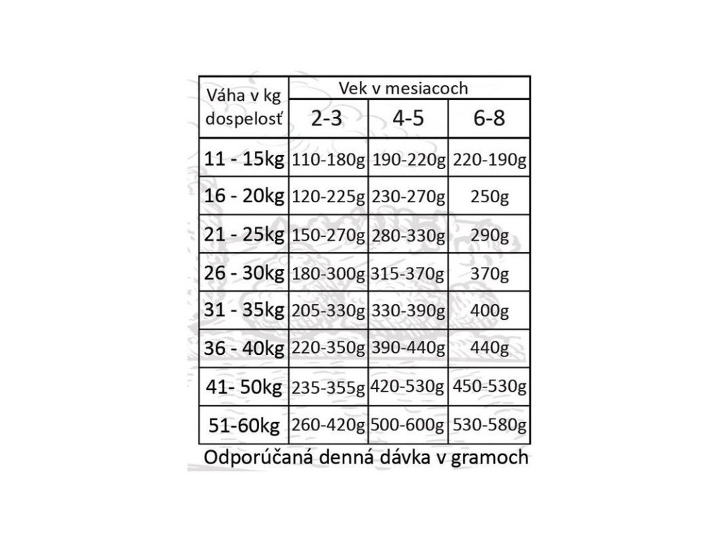 Pokyny: krmivo Fresh Farm Puppy je kompletné krmivo s obsahom všetkých živín potrebných pre zdravý vývoj Vášho šteňaťa. Nezabudnite však zabezpečiť neustály prístup k čistej čerstvej vode. Odporúčané dávkovanie môžete vidieť v tabuľke vpravo. Pri zmene krmiva odporúčame postupný prechod minimálne počas doby 2 týždňov tak, aby si organizmus psa zvykol na zmenu. Skladujte na suchom a chladnom mieste.