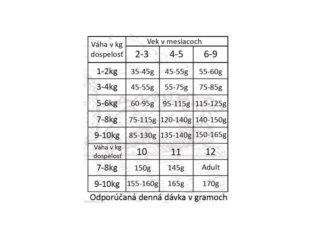 Pokyny: krmivo Fresh Farm Puppy&Junior je kompletné krmivo s obsahom všetkých živín potrebných pre zdravý vývoj Vášho šteňaťa. Nezabudnite však zabezpečiť neustály prístup k čistej čerstvej vode. Odporúčané dávkovanie môžete vidieť v tabuľke vpravo. Pri zmene krmiva odporúčame postupný prechod minimálne počas doby 2 týždňov tak, aby si organizmus psa zvykol na zmenu. Skladujte na suchom a chladnom mieste.
