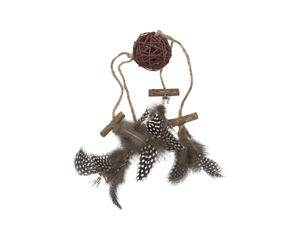 Atraktívna hračka pre mačky z morskej trávy s pierkami. Veľkosť 18 cm, farba podľa dostupnosti. Ideálna na zábavu a stimuláciu mačiek.