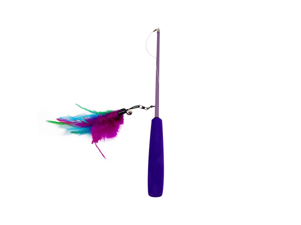 Na konci je ľahký vlasec s pierkami vo fialových odtieňoch, ktoré sa pohybujú ako skutočná korisť - stimulujú prirodzený lovecký inštinkt vašej mačky.