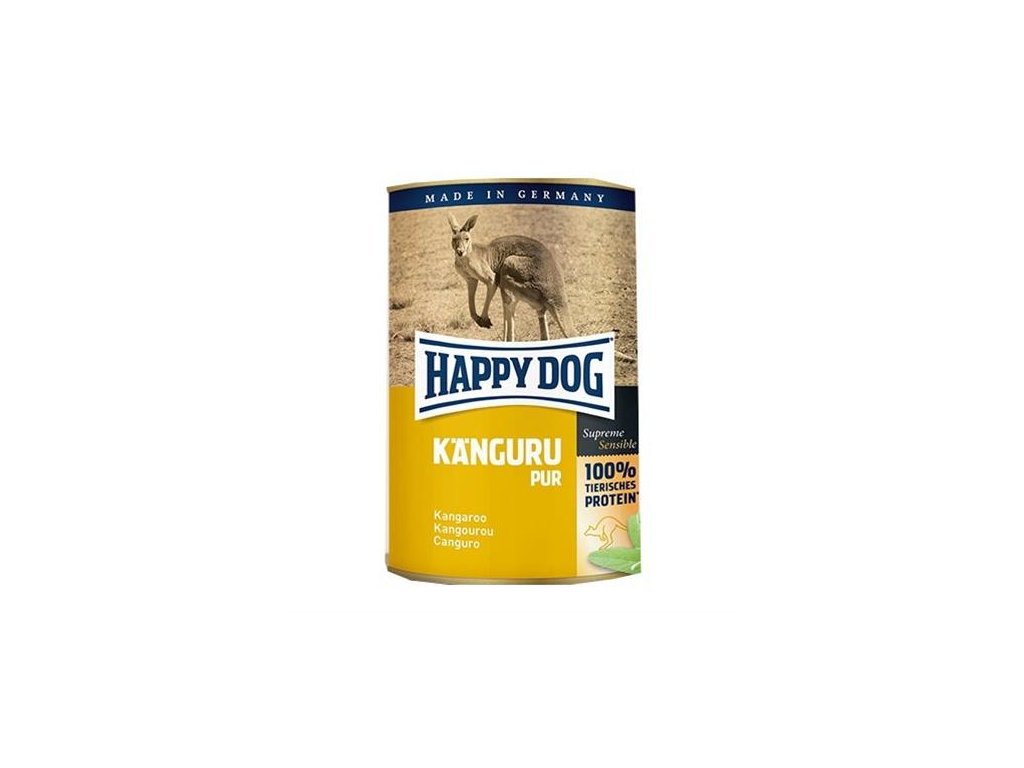 Vlhké kompletné krmivo pre psov HAPPY DOG Känguru Pur sa vyrába výhradne iba z čerstvého klokanieho mäsa, bez sóje a bez rastlinných prísad a takisto bez umelých farbív a konzervačných látok.