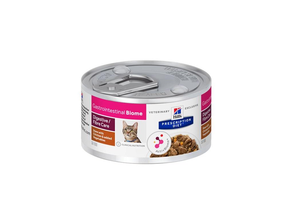Hill's Prescription Diet Gastrointestinal Biome je mokré krmivo pre mačky s vysokým obsahom vlákniny, u ktorého bolo klinicky overené, že podporuje pravidelnú zdravú stolicu počas 24 hodín a pomáha znižovať riziko recidívy. Obohacené o technológiu ingrediencií ActivBiome+, ktorá rýchlo vyživuje strevný mikrobióm a pomáha zvládať zložité GI problémy.
