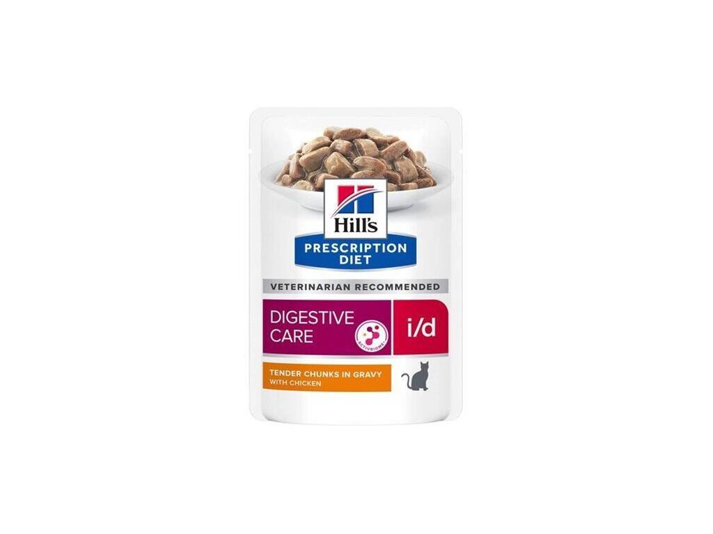 - Krmivo Hill's Prescription Diet i/d Digestive Care Kura bolo vyvinuté špeciálne pre mačky trpiace ochoreniami tráviaceho traktu alebo resorpčnými črevnými poruchami. Obsahuje zvýšené množstvo elektrolytu, malé množstvo tuku a ľahko stráviteľné komponenty. Toto diétne kompletné krmivo je tak vhodné pri gastrointestinálnych poruchách, exokrinnej pankreatickej insuficiencii, zápche, maldigescii a pri nedostatečnom trávení. Podávať ho môžete tiež mačkám zotavujúcim sa z chirurgického zákroku v oblasti čriev, dospievajúcim mačiatkam alebo obéznym mačkám s akútnymi gastrointestinálnymi ochoreniami.