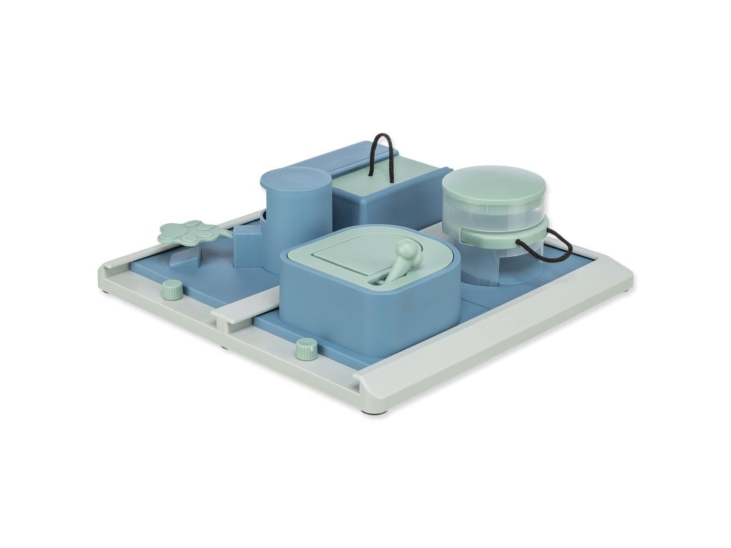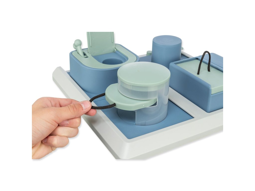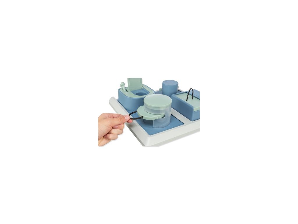 Schovajte granule alebo maškrtu do hračky a nechajte psa si užiť zábavu s hľadaním. Pes môže použiť labu alebo ňufák na posúvanie plastových štvorcov, ich otvorenie alebo nadvihnutie častí hračky a získať tak maškrtu.