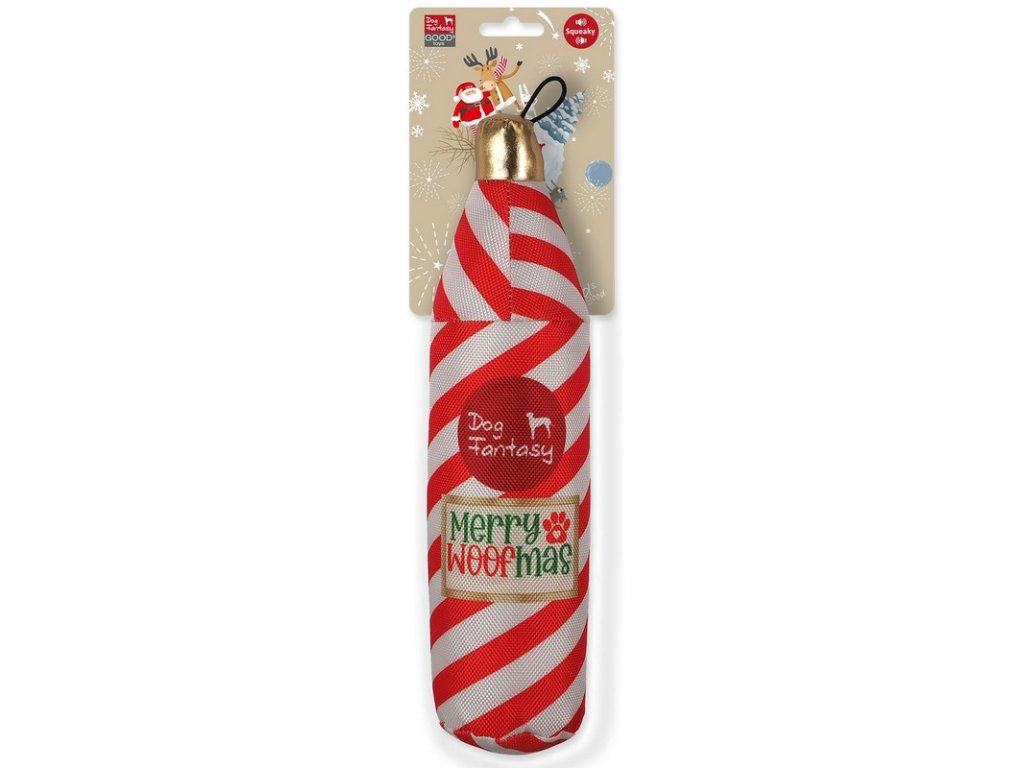 Hračka Dog fantasy winter tale vianočná fľaša červeno biela pískacia, šuštiaca 28cm