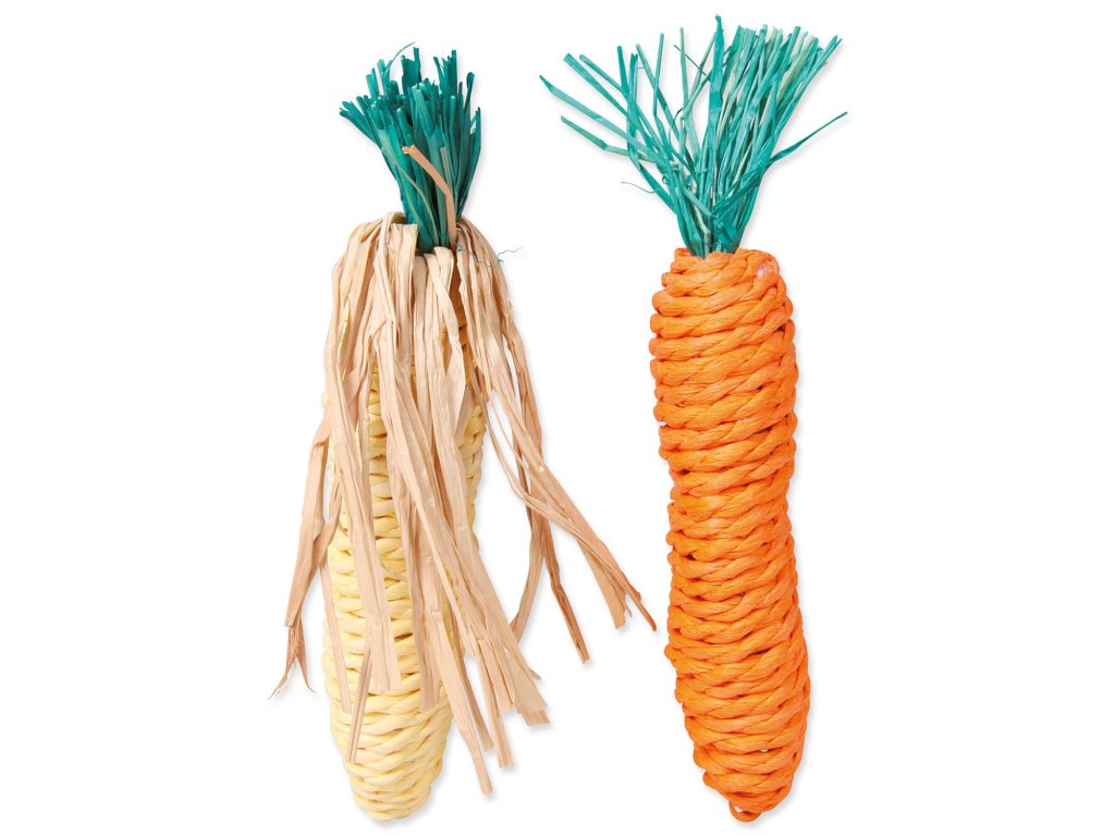 Hračka pro králíky a drobné hlodavce slaměná mrkev a kukuřice.