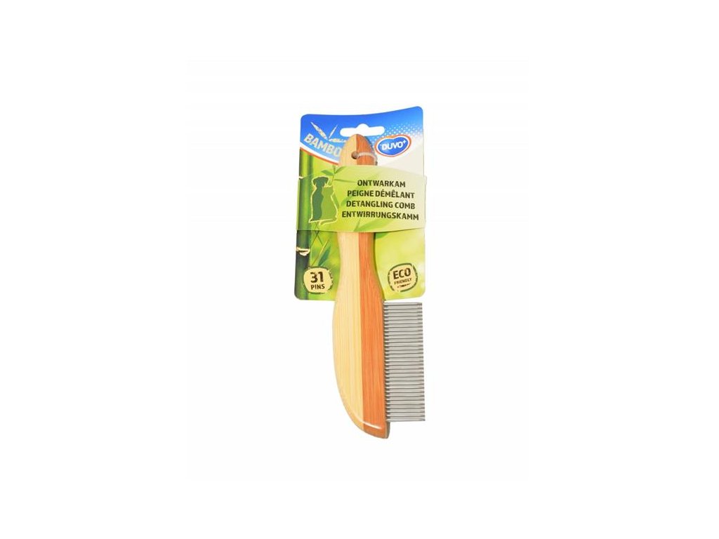 Obojstranný hrebeň s drevenou rukoväťou. Hrebeň s drevenou rukoväťou a stredne jemnými aj jemnými zubami. Pre všetky plemená psov.