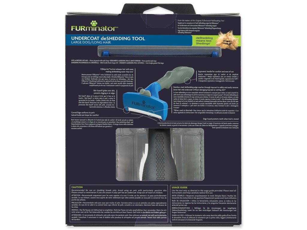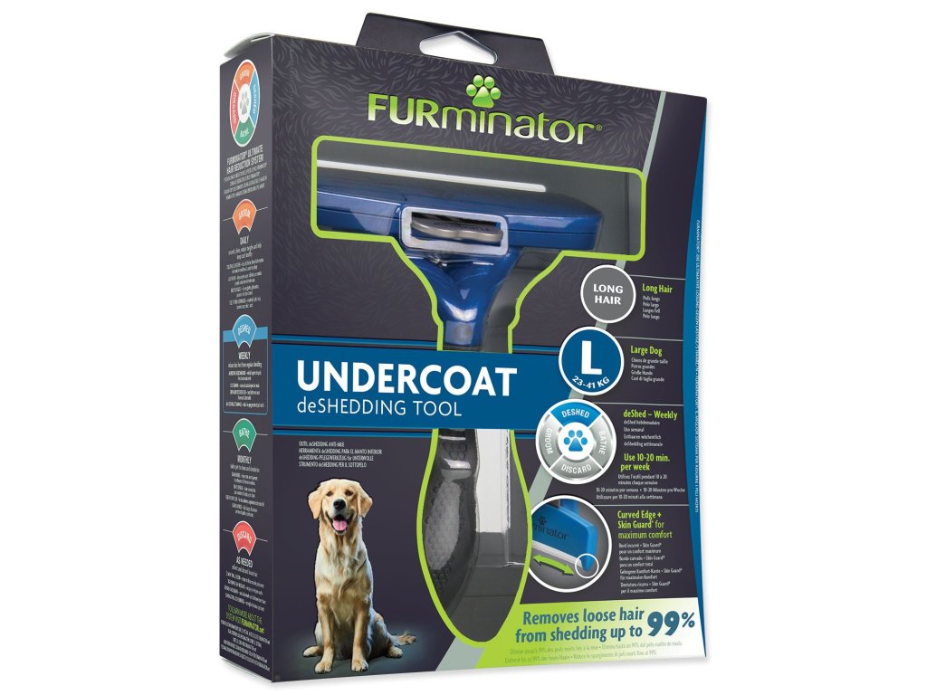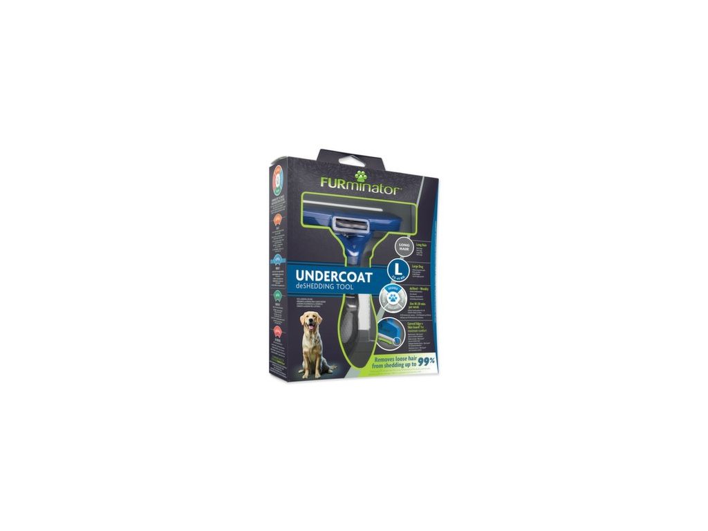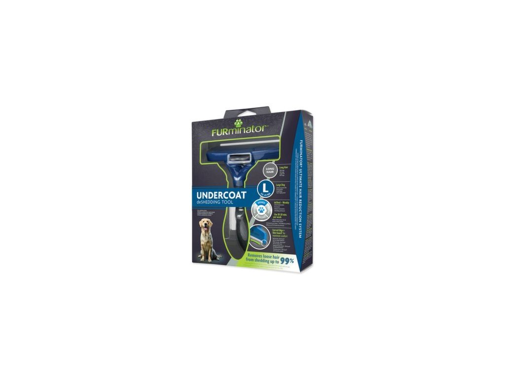 FURminator® hrablo na vyčesávanie podsady pre psov veľkých s hmotnosťou do 24-41 kg s dlhou srsťou. Odstraňuje až 99% uvoľnených chlpov. Pomáha tiež redukovať tvorbu chlpových bezoárov. Používajte na suchú srsť raz či dvakrát týždenne po dobu 10 až 20 minút.