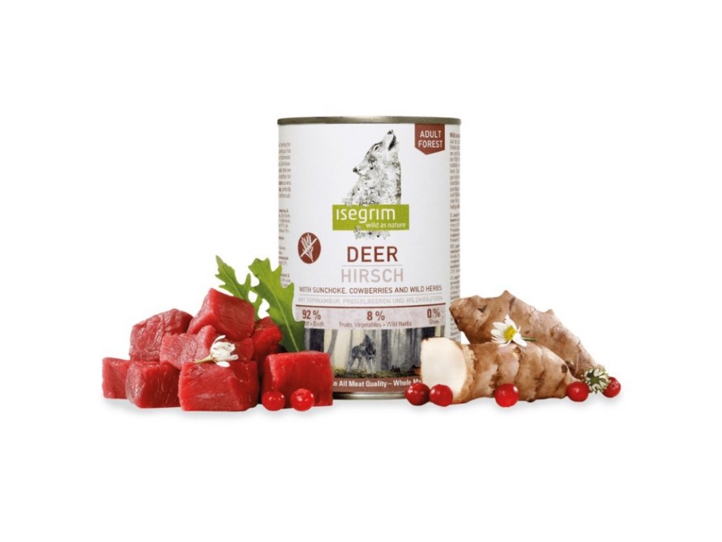 Isegrim Dog Adult Deer + Sunchoke, Cowberries & Wild Herbs je konzerva so špeciálnou receptúrou z čerstvého jeleňa a hydinového mäsa ako chutná kombinácia na každodenné kŕmenie. Navyše vložená slnečnica hľuznatá obsahuje inulín pre dobré trávenie a brusnice bohaté na minerálne látky a vitamíny, ktoré Váš dospelý pes potrebuje.