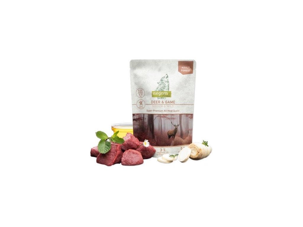 Isegrim dog adult roots deer & game kapsička je kompletné krmivo určené pre dospelé psy. Toto menu, inšpirované kŕmnym územím psích predkov, kombinuje zverinu s petržlenovou vňaťou. Obzvlášť bohaté na vitamín C a bylinky. Hlavnou zložkou tejto kapsičky je diviak a jeleň, ktoré poskytujú vyvážené a kvalitné živiny.