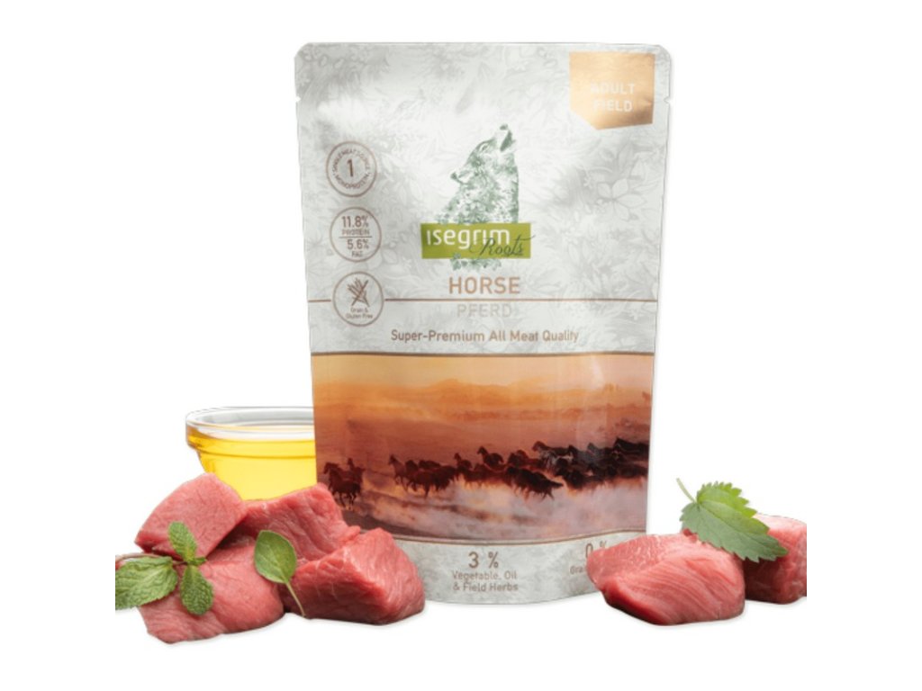 Isegrim dog adult roots horse kapsička je kompletné krmivo určené pre dospelé psy. Toto menu, inšpirované kŕmnym územím psích predkov, kombinuje koňa s bylinkami. Hlavnou zložkou tejto kapsičky je kôň, ktorý poskytuje vyvážené a kvalitné živiny. Kapsička obsahuje len jeden druh proteínu a preto je vhodná aj pre psy s alergiou, alebo citlivým trávením.