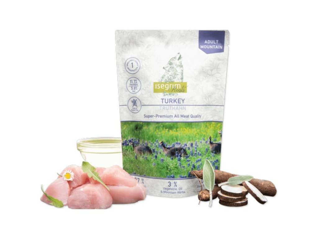 Isegrim dog adult roots turkey kapsička je kompletné krmivo určené pre dospelé psy. Toto menu, inšpirované kŕmnym územím psích predkov, kombinuje morčacie mäso s bylinou kozia brada. Hlavnou zložkou tejto kapsičky je morka, ktorá poskytuje vyvážené a kvalitné živiny. Kapsička obsahuje len jeden druh proteínu a preto je vhodná aj pre psy s alergiou, alebo citlivým trávením.