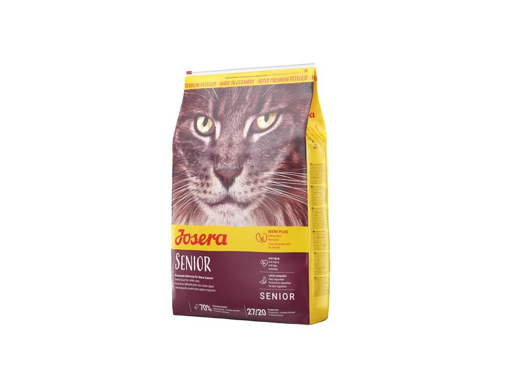Josera predstavuje kompletné krmivo pre starnúce mačky. Vďaka zníženému obsahu fosforu a vpridanými antioxidantami je Josera Senior ideálne krmivo pre starnúce mačky. Špeciálne vybrané zložky zabezpečujú znížené množstvo fosforu a tak podporujú činnosť obličiek. Toto je obzvlášť dôležité pre staršie mačky. Pridané cenné antioxidanty ako vitamíny C a E ochraňujú obličky pred voľnými radikálmi.