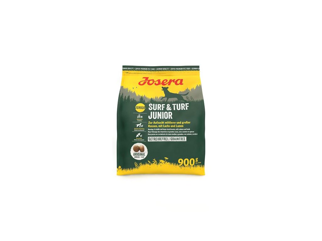 Krmivo Josera Surf & Turf Junior s vysokokvalitnými bielkovinami z jahňaciny a lososa ponúka dospievajúcim psom stráviteľné a chutné menu na každý deň. Krmivo obsahuje všetky dôležité živiny pre zdravý rast.