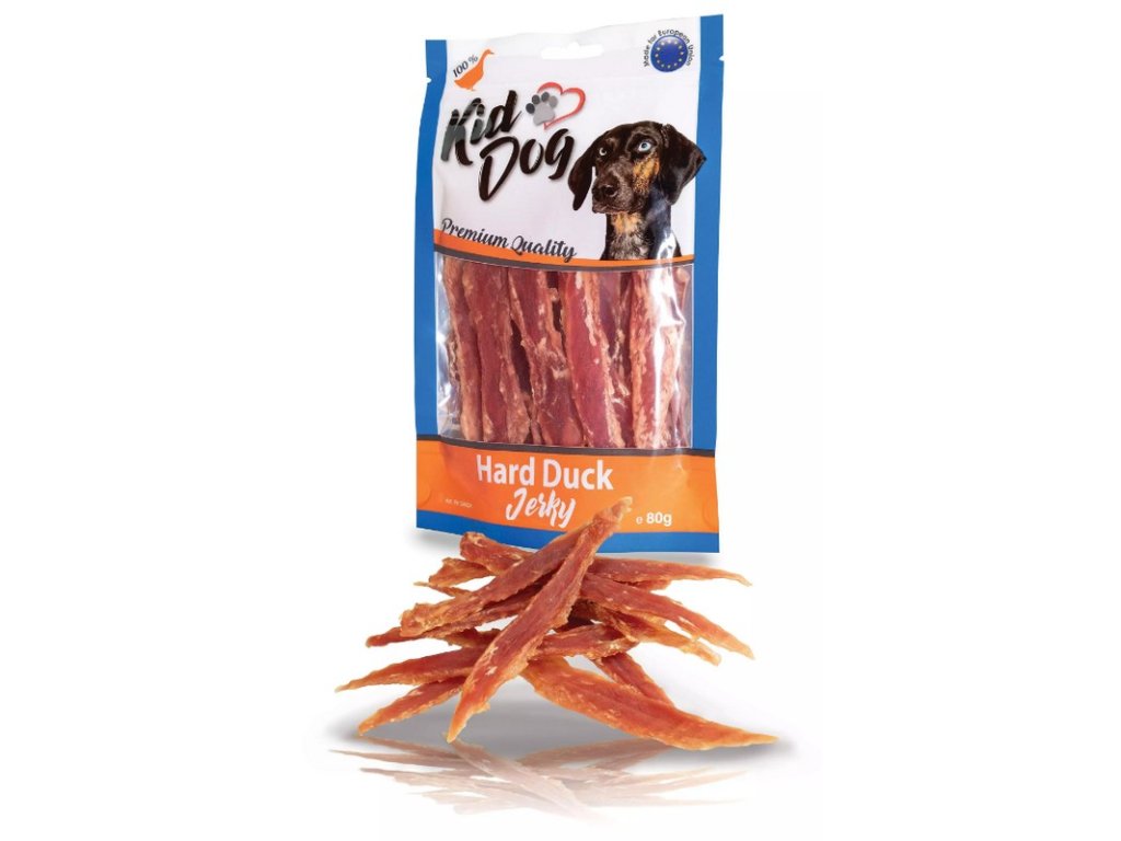 Kid Dog kačacie prsia sú lahodný pamlsok z kačacieho mäsa, ktorým potešíte všetky veľkosti a plemená psov. Pamlsok je pomerne mäkký a dá sa tak nalámať alebo nastrihať na menšie kúsky. V balíčku sú rôzne veľké kusy.