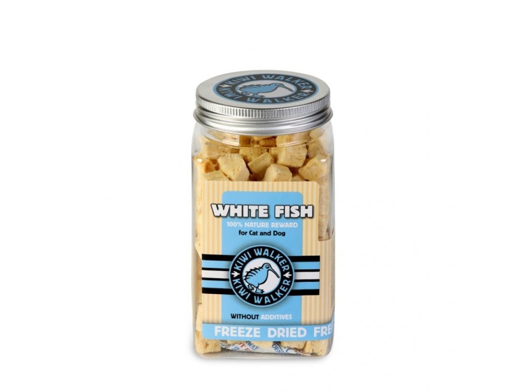 Kiwi Walker pamlsky sú tou najlepšou odmenou pre Vašich štvornohých kamarátov. Obsahujú 100% - nú bielu rybu sušenú mrazom a sú bez konzervantov a pridaných látok. Týmto sušením (lyofilizáciou) sa v pochúťke zachovávajú bielkoviny, vitamíny a minerály, ktoré prispievajú ku zdraviu vášho miláčika. Pochúťky sú vhodné pre všetky typy plemien s normálnou aj vysokou aktivitou. Doplnkové krmivo pre psov a mačky.