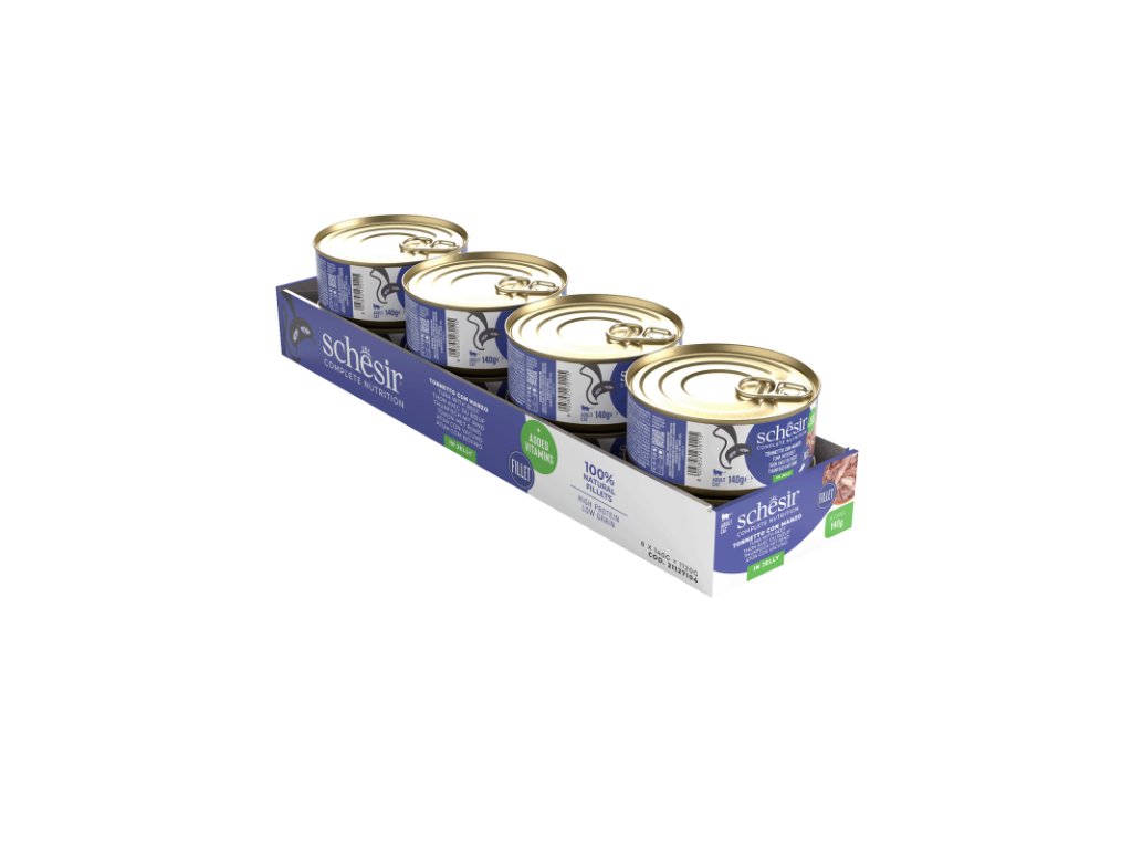 Konzerva s mäsom z tuniaka a hovädzími filetami. Doplnkové krmivo pre dospelé mačky. Kŕmny návod: mačkám s hmotnosťou cca 4kg podávajte maximálne 2 konzervy denne, v kombinácií s mokrým alebo suchým kompletným krmivom Schesir Zloženie: ryby a výrobky z rýb (51% mäso z tuniaka), mäso a živočíšne produkty (7% hovädzie filety), 1,5% ryža Akostné znaky: hrubé proteíny 12%, vlhkosť 85%, hrubé oleje a tuky 0,5%, hrubé popoloviny 1%, hrubá vláknina 0,5%, vitamín A 1325 m.j./kg, vitamín E (alfatokoferol) 15 mg/kg, taurín 160 mg/kg Zdravie: bez problémov Zloženie: tuniak, hovädzie Kvalita: ***** Superpremium Hmotnosť: 0,14kg Typ mokrého krmiva: konzervy Vek mačky: dospelá mačka