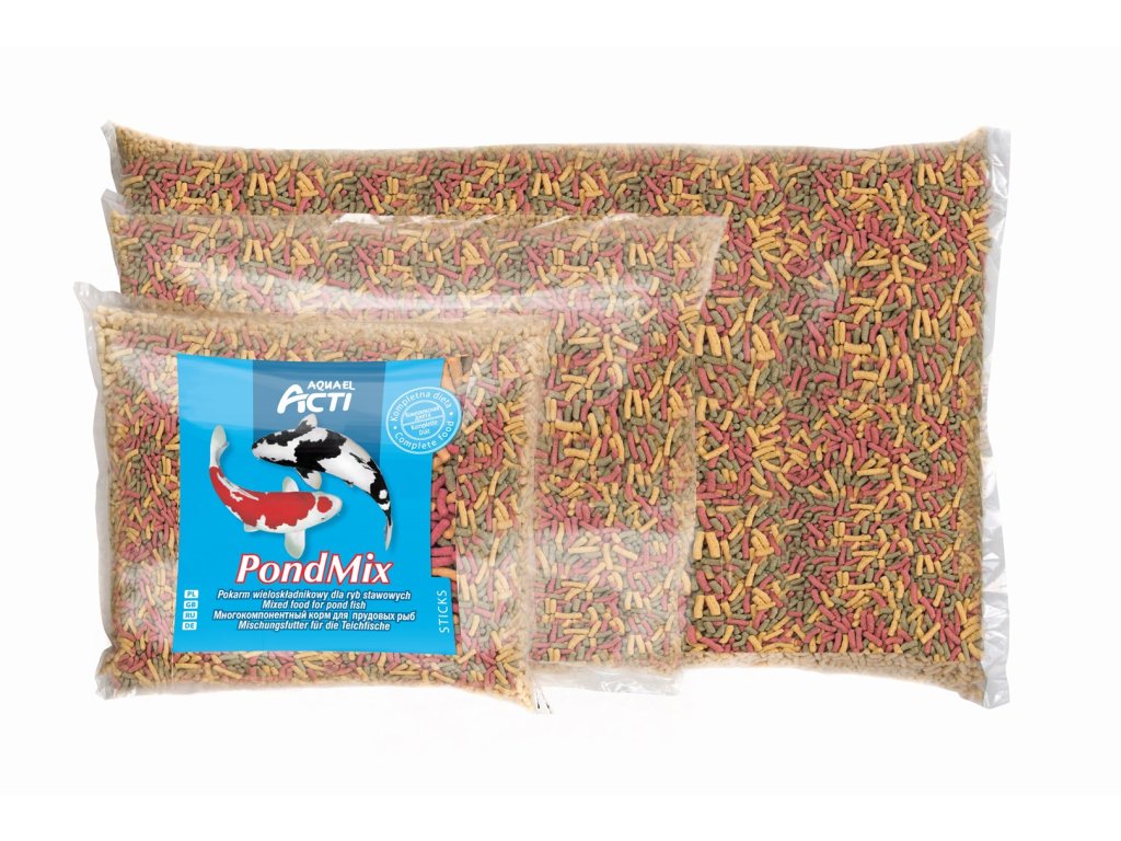 Univerzálna zmes určená pre všetky okrasné kaprovité ryby. Obsahuje ACTI POND BASIC, ACTI POND COLOR a zeleninové tyčinky. Vďaka vysokému obsahu bielkovín s kompletnou sadou aminokyselín, ako aj vitamínov a stopových prvkov je kompletným zdrojom potravy. Poskytuje rozmanité krmivo, ktoré ochotne prijímajú aj vyberavé ryby. AQUAEL ACTI POND MIX je kompletné krmivo, t. j. obsahuje všetky živiny pre ryby v jazierku a môže sa používať ako jediné krmivo. Nespôsobuje zakalenie vody v jazierku.