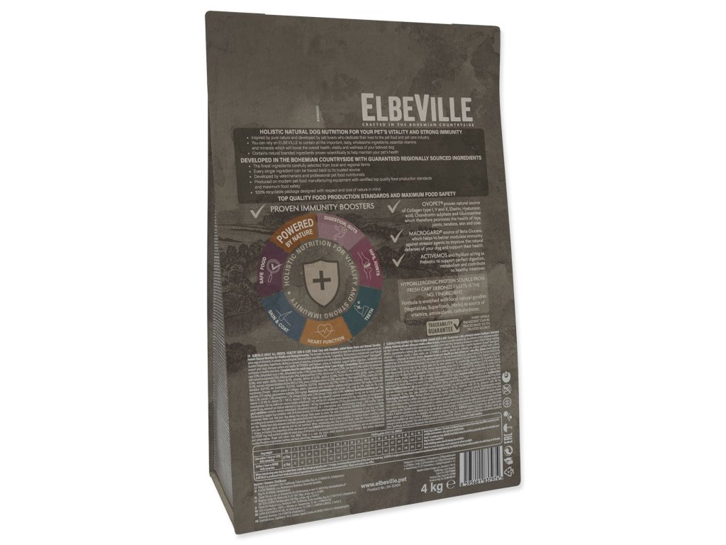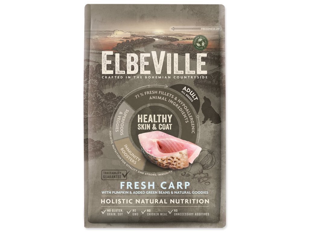ELBEVILLE je prirodzená strava pre celkové zdravie Vášho psa. Je vyrobená z najlepších prírodných, lokálnych surovín vrátane tzv. superpotravín a s vysokým obsahom kvalitného čerstvého mäsa. Táto receptúra obsahuje 35 % čerstvých vykostených filiet z kapra a ďalej 28 % dehydrovaného kačacieho a morčacieho.
