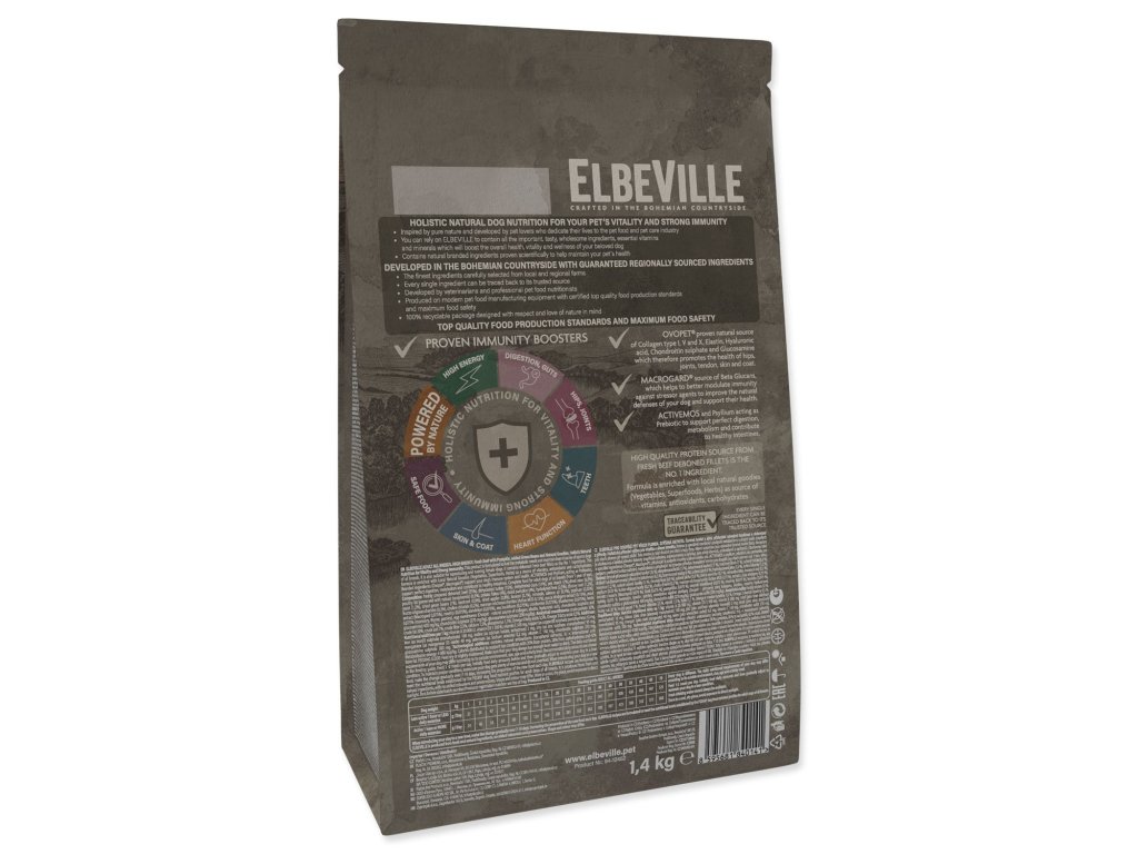 ELBEVILLE je prirodzená strava pre celkové zdravie Vášho psa. Je vyrobená z najlepších prírodných, lokálnych surovín vrátane tzv. superpotravín a s vysokým obsahom kvalitného čerstvého mäsa. Táto receptúra obsahuje 35% čerstvých vykostených filiet z hovädzieho a ďalej 26% dehydrovaného kačacieho a morčacieho.