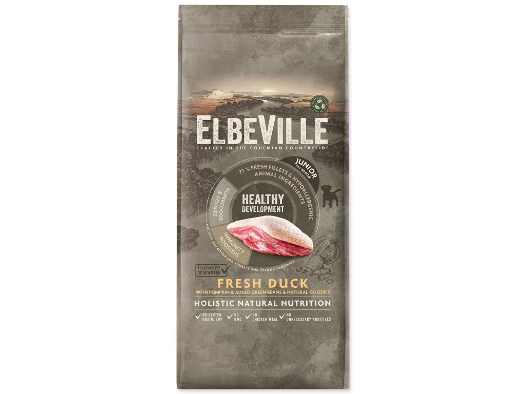 ELBEVILLE je prirodzená strava pre celkové zdravie Vášho psa. Je vyrobená z najlepších prírodných, lokálnych surovín vrátane tzv. superpotravín a s vysokým obsahom kvalitného čerstvého mäsa. Táto receptúra obsahuje 35 % čerstvých vykostených filiet z kačice a ďalej 28 % dehydrovaného kačacieho a morčacieho.