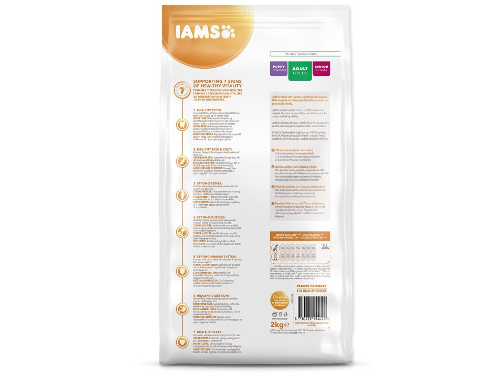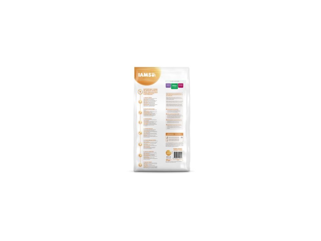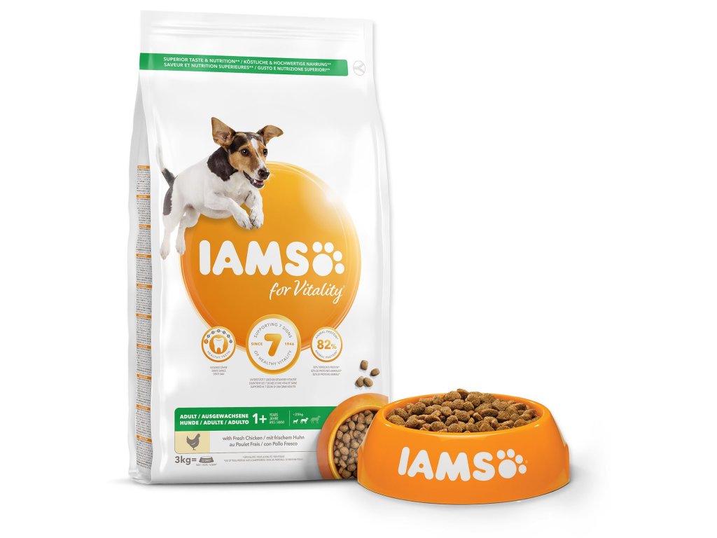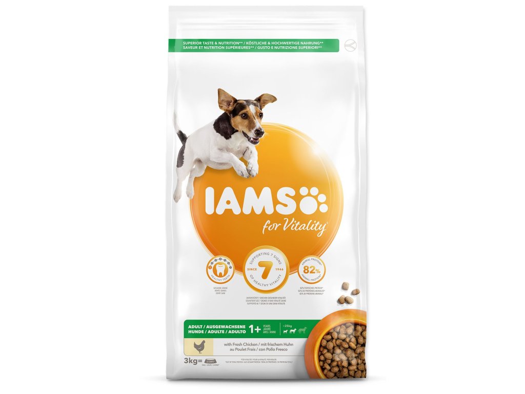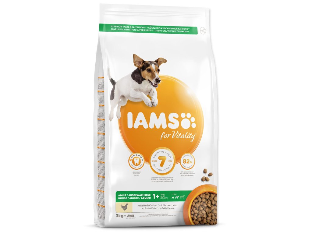 Krmivo IAMS for Vitality pre dospelých psov malých a stredných plemien je 100% kompletné a vyvážené odborníkmi zostavené krmivo, ktoré bude vášmu zvieraťu chutiť a svedčiť. Naša nová a vylepšená receptúra pre dospelých psov s čerstvým kuracím mäsom je založená na kvalitných živočíšnych bielkovinách, ktoré boli starostlivo vybrané, aby podporovali sedem znakov zdravej vitality psa. Aby bol váš pes zdravý, aktívny a plný energie, obsahujú naše lahodné receptúry až 82% živočíšnych bielkovín (z celkového obsahu bielkovín).
