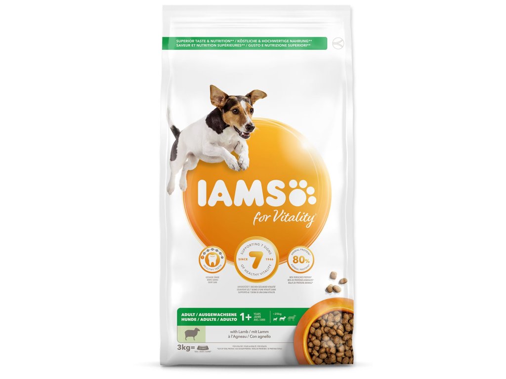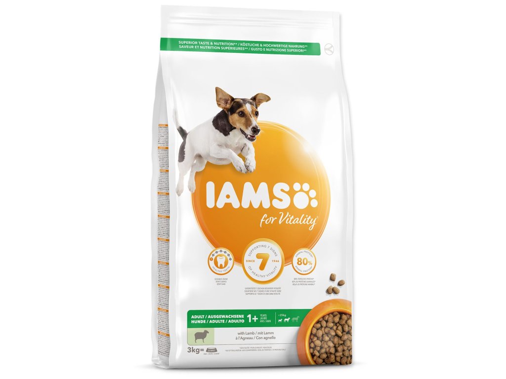 Krmivo IAMS for Vitality pre dospelých psov malých a stredných plemien je 100% kompletné a vyvážené odborníkmi zostavené krmivo, ktoré bude vášmu zvieraťu chutiť a svedčiť. Naša nová a vylepšená receptúra pre dospelých psov s jahňacím mäsom je založená na kvalitných živočíšnych bielkovinách, ktoré boli starostlivo vybrané, aby podporovali sedem znakov zdravej vitality psa. Aby bol váš pes zdravý, aktívny a plný energie, obsahujú naše lahodné receptúry až 80% živočíšnych bielkovín (z celkového obsahu bielkovín).