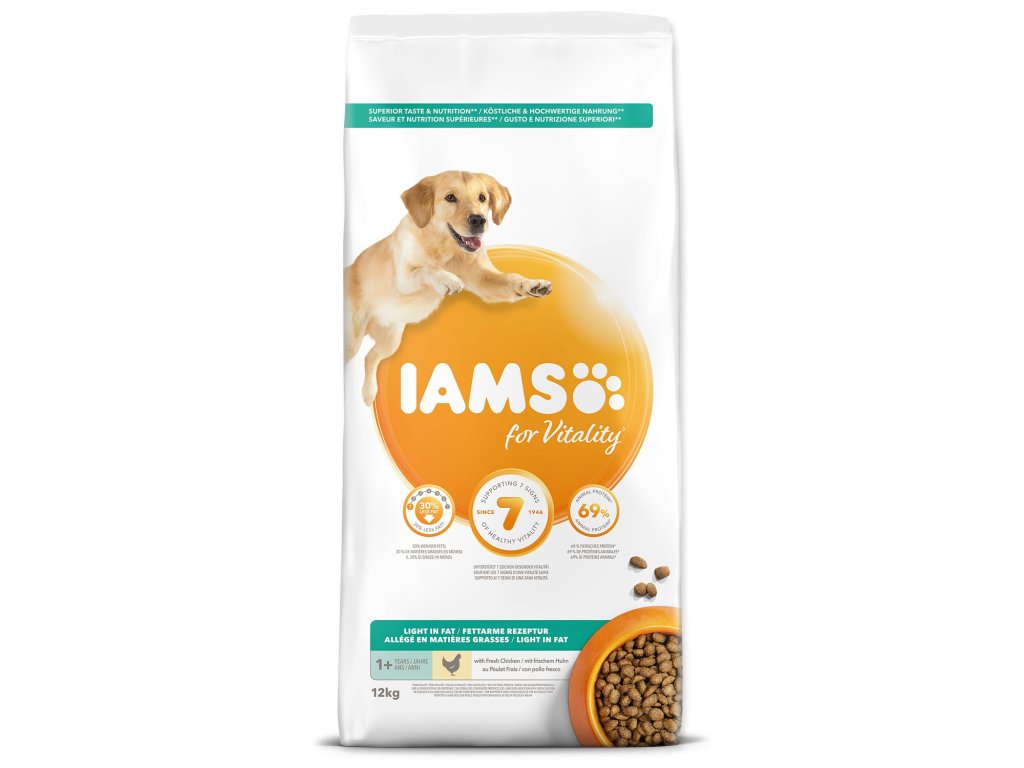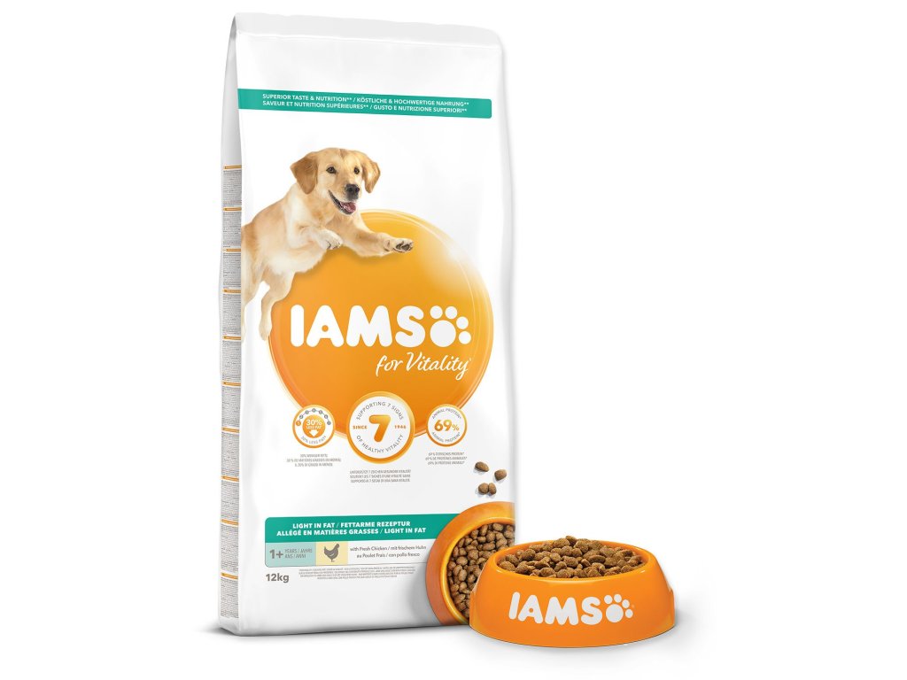 Krmivo IAMS for Vitality s nízkym obsahom tuku pre dospelých psov a psích seniorov všetkých plemien je 100% kompletné a vyvážené, odborníkmi zostavené krmivo, ktoré bude vášmu zvieraťu chutiť a svedčiť. Naša nová a vylepšená receptúra s čerstvým kuracím mäsom je založená na starostlivo vybraných, kvalitných živočíšnych bielkovinách, ktoré podporujú sedem znakov zdravej vitality psa. Aby bol váš pes zdravý, aktívny a plný energie, obsahujú naše lahodné receptúry až 69% živočíšnych bielkovín (z celkového obsahu bielkovín). Naša receptúra s nízkym obsahom tuku a pre kastrované zvieratá skvele pomáha regulovať hmotnosť psa.