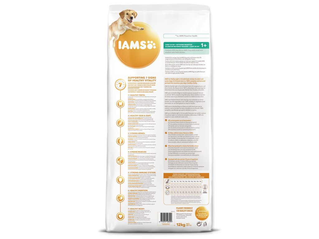 Naším záväzkom je dopriať psom špecializované krmivo so skvelou chuťou, ktoré si váš domáci maznáčik bezvýhradne zamiluje a ktoré bude podporovať všetkých sedem znakov zdravej vitality. Oproti krmivu IAMS pre dospelých psov s čerstvým kuracím mäsom obsahuje táto receptúra o 30% menej tuku ako naša bežná receptúra pre dospelých psov, takže prispieva k udržaniu zdravej telesnej hmotnosti. Chrumkavé granule a optimálna hladina minerálov stará o zdravie psích zubov a znižuje vznik zubného kameňa.