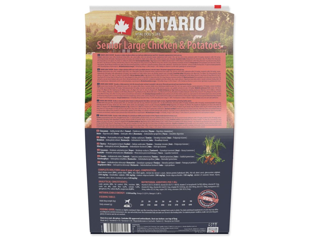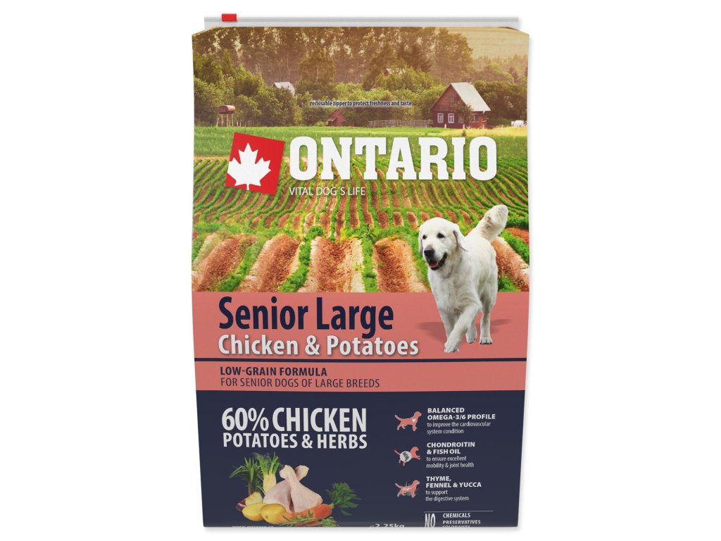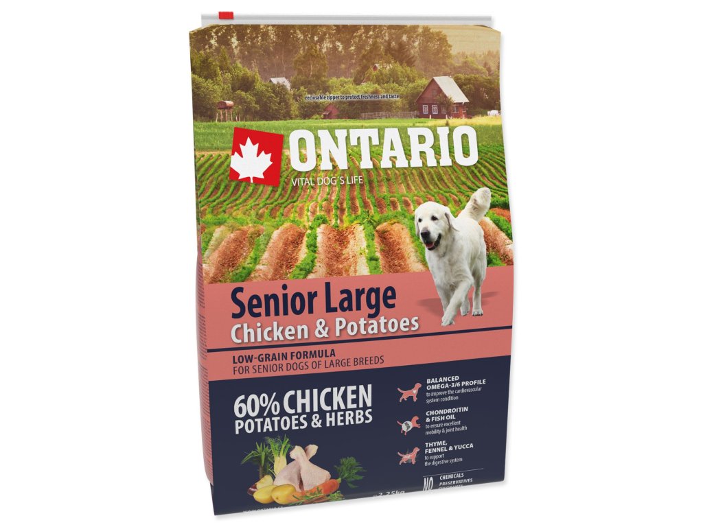 musí spĺňať všetky výživové a nutričné požiadavky pre zdravé fungovanie celého organizmu. Najmä pri starších psoch je potrebné brať do úvahy stupeň aktivity, pretože sa pohyblivosť s vekom znižuje, je potrebné tomu prispôsobiť i zloženie krmiva. Preto značka Ontario vyvinula v spolupráci s veterinármi a nutričnými špecialistami unikátnu a výnimočne chutnú receptúru, ktorá poskytuje vyvážené zloženie so zníženým obsahom tuku a správny pomer všetkých živín vhodných pre starnúceho psa. Kvalitná strava je jednou z najdôležitejších podmienok pre zdravý a dlhý život Vášho psa. Receptúra založená na vysokom podiele proteínov z kuracieho mäsa a na zemiakoch, ktoré sú po tepelnej úprave najlepším zdrojom sacharidov. Vyvážené omega 3 a 6 mastné kyseliny pre podporu kardiovaskulárneho systému. S nízkym obsahom obilnín, bez pšenice alebo kukurice. Jedinou obilninou je ryža. Chondroprotektíva a rybí olej pre zaistenie zdravej pohybovej sústavy a kĺbov. Krmivo obsahuje špeciálny mix byliniek a korenia, najmä tymián, fenikel a juku, pre podporu správneho trávenia.
