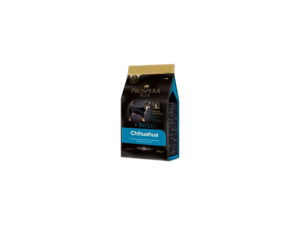 PROSPERA PLUS Chihuahua je superprémiové krmivo, navrhnuté s ohľadom na unikátnu výživové potreby plemena Čivava. Základom receptúry je kvalitné, ľahko stráviteľné kuracie mäso doplnené o funkčné prísady extraktu zo zeleného čaju a rozmarínu, ktoré posilňujú imunitu psíkov. Krmivo je obohatené o rybí tuk (omega 3 mastné kyseliny) a pupalkový olej, ktoré podporujú zdravú srsť tohto plemena. Chondroprotektíva glukosamín a chondroitín pomáhajú posilňovať a stabilizovať kosti a kĺby. Špeciálny tvar granúl pomáha k prevencii pred zubným kameňom a povlakom.
