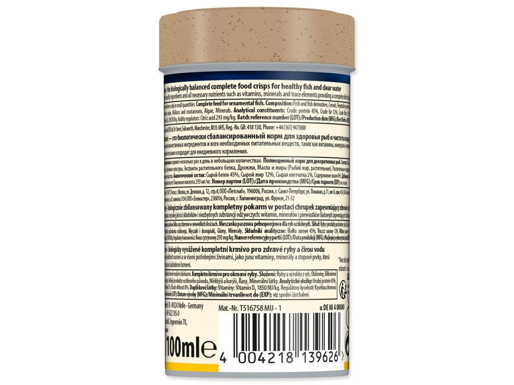Zloženie: ryby a vedľajšie výrobky z rýb, obilniny, bielkovinové extrakty rastlinného pôvodu, droždie, mäkkýše a kôrovce, oleje a tuky, mlieko a mliečne výrobky, vodné riasy, cukor, minerálne látky, lecitín, kyselina citrónová, L-karnitín.