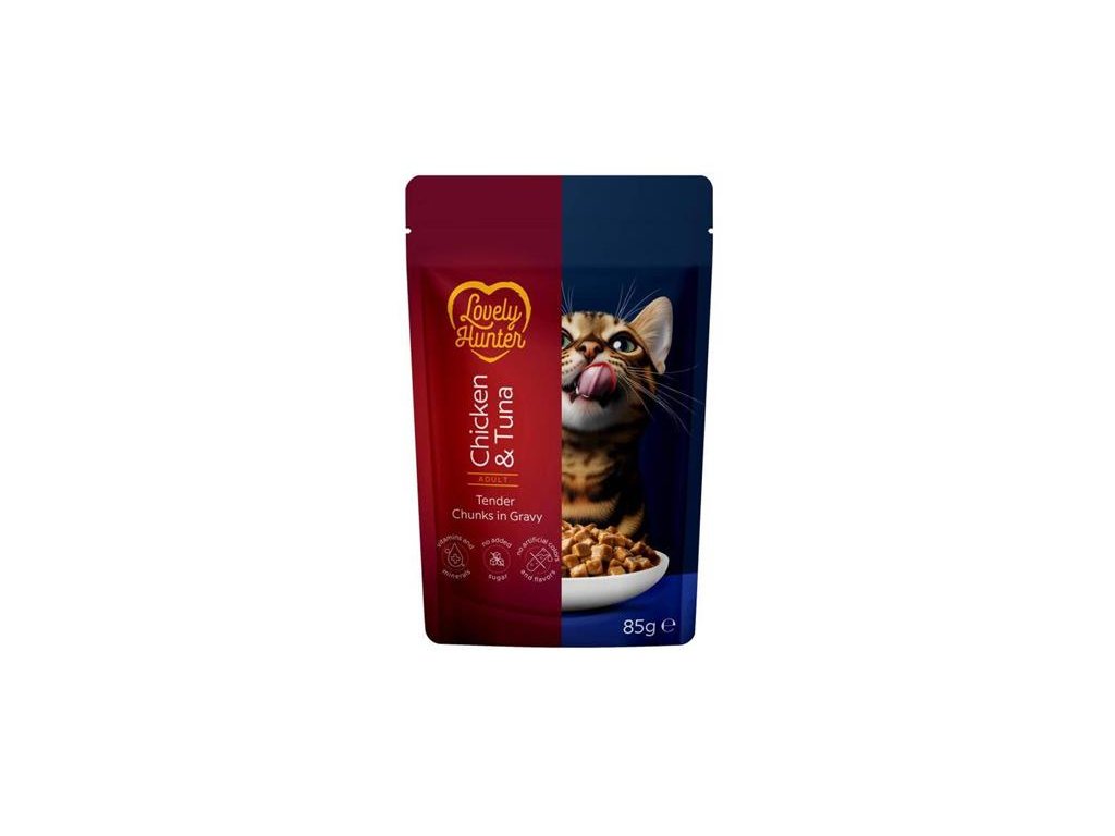 Mokré krmivo Lovely Hunter s kuracím mäsom a tuniakom je každodenné riešenie, ktoré kombinuje skvelú chuť a základné živiny pre dospelé mačky.