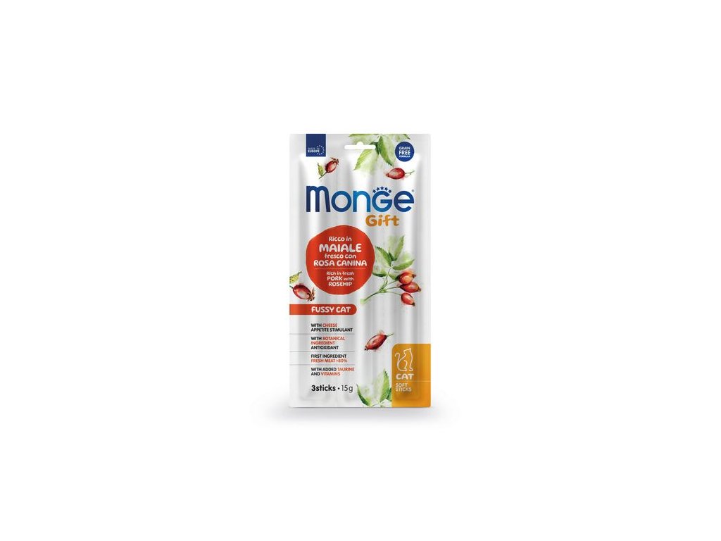 MONGE GIFT Soft Sticks Fussy cat 15g/3ks mäkké pochúťky pre mačky so šípkami a syrom