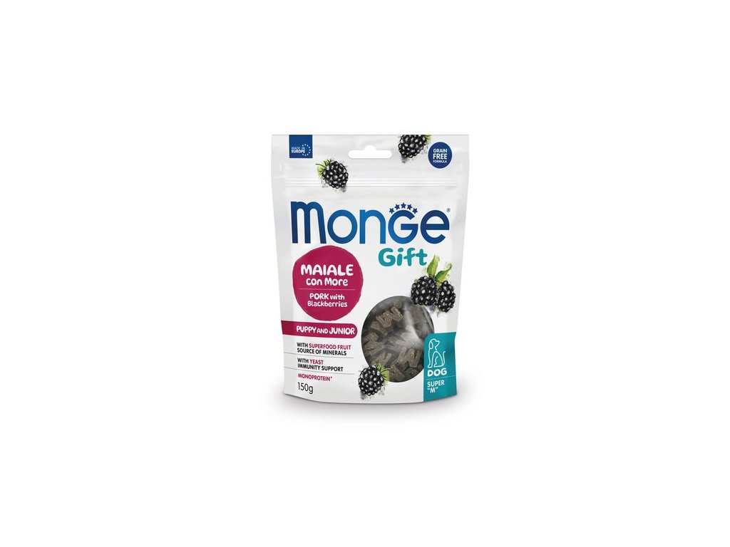 MONGE GIFT Super M Puppy and Junior 150g pochúťky pre šteňatá s bravčovým mäsom a černicami