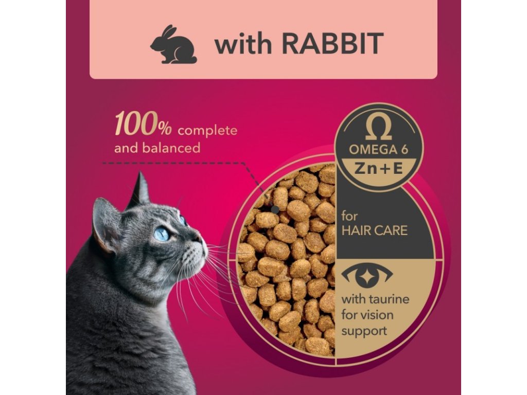 ZLOŽENIE: obilniny, mäso a živočíšne deriváty 27 % (4 % z králika), deriváty rastlinného pôvodu, oleje a tuky, minerály, kvasnice.