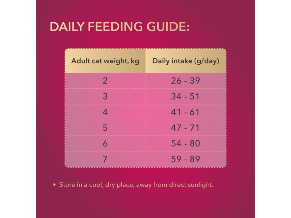 Zloženie: obilniny, mäso a produkty živočíšneho pôvodu 28 % (4 % kuracieho mäsa; 1,2 % dehydrovaného kuracieho mäsa, ekvivalentného 4 % mäsa s prirodzenou vlhkosťou; 4 % hovädzieho mäso), produkty rastlinného pôvodu, oleje a tuky, minerálne látky, zelenina 0,8 % (0,4 % sušená mrkva, čo zodpovedá 2,65 % prirodzenej vlhkosti mrkvy; 0,4 % sucha petržlen, čo zodpovedá 2,65 % prirodzenej vlhkosti petržlenu), kvasnice.