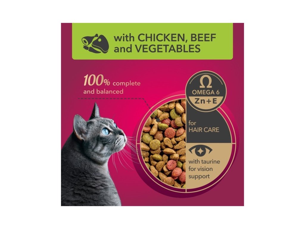Zloženie: obilniny, mäso a produkty živočíšneho pôvodu 28 % (4 % kuracieho mäsa; 1,2 % dehydrovaného kuracieho mäsa, ekvivalentného 4 % mäsa s prirodzenou vlhkosťou; 4 % hovädzieho mäso), produkty rastlinného pôvodu, oleje a tuky, minerálne látky, zelenina 0,8 % (0,4 % sušená mrkva, čo zodpovedá 2,65 % prirodzenej vlhkosti mrkvy; 0,4 % sucha petržlen, čo zodpovedá 2,65 % prirodzenej vlhkosti petržlenu), kvasnice.