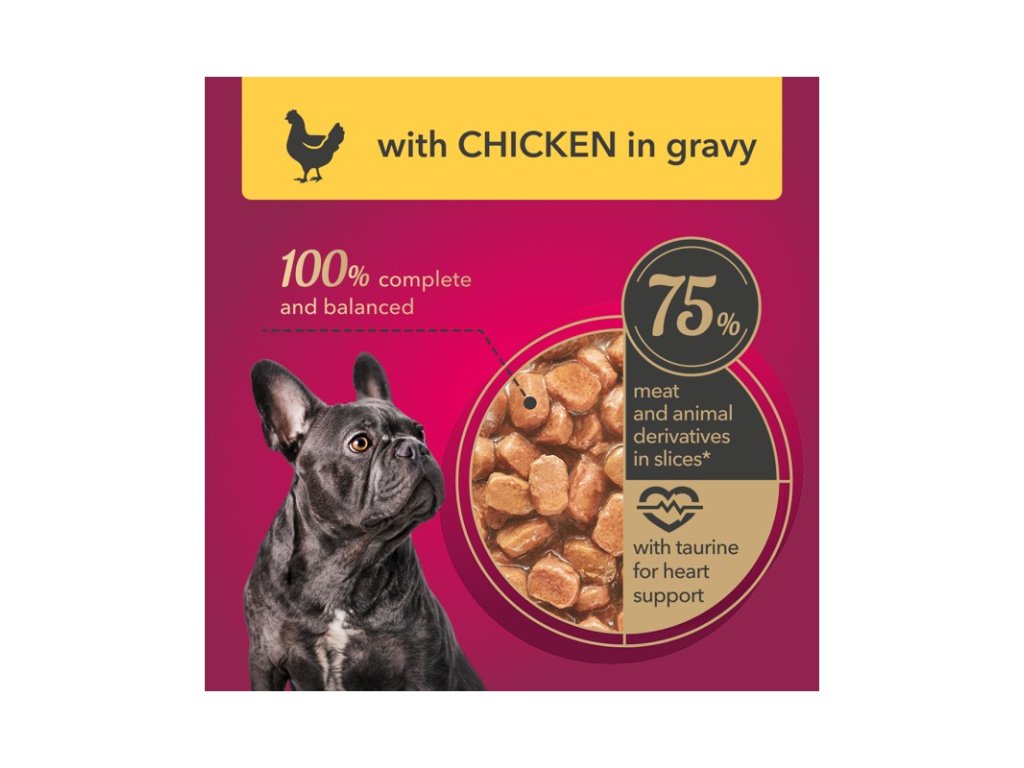 Vlhké krmivo obsahuje 75 % mäsa a živočíšnych produktov v každom plátku!