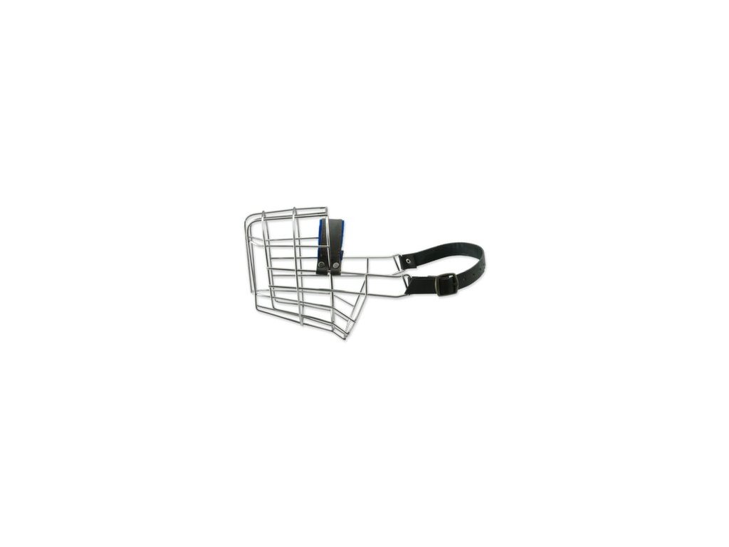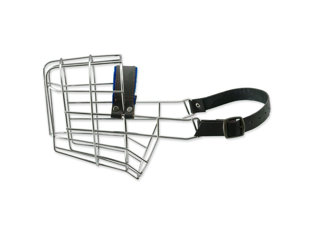 Kovový náhubok s koženými remienkami na zapínanie, vhodný napríklad pre plemeno kólie.