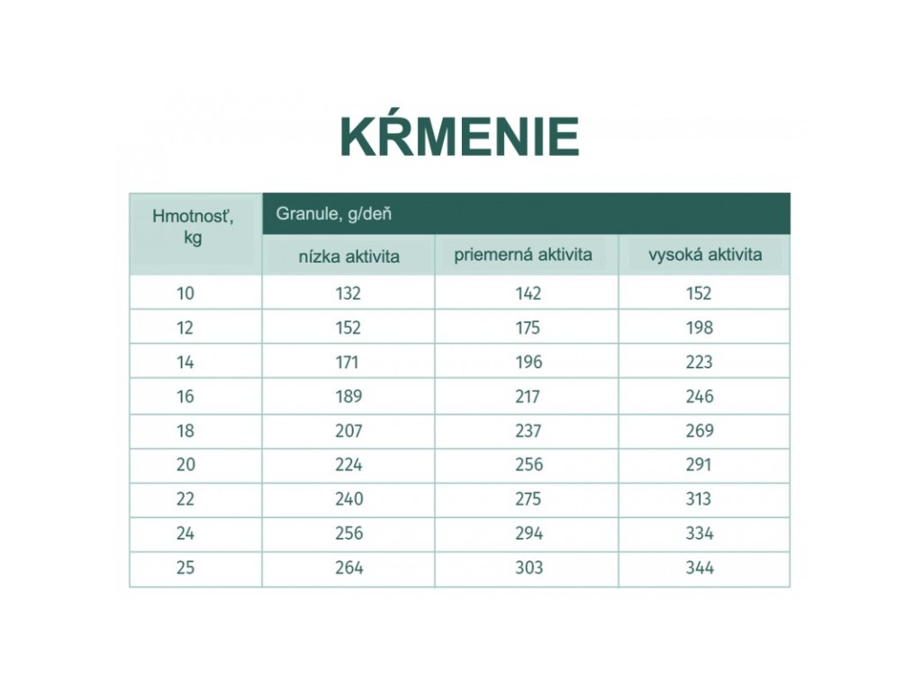 Zloženie: Dehydrovaný proteín z morčacieho mäsa 30 %, kukurica, ryža, hydinový tuk, morčacie mäso 5%, hydrolyzované živočíšne proteíny, lososový olej 2% minerálne látky, repné odrezky, ľanové semená 1,26% pivovarské kvasnice, brusnice 0 2%, borákový olej 0,1%, MacroGard ® (β-glukán zdroj) 0,05%, Actigen ™ (zdroj prebiotik- mananooligosaharidy) 0,04%, Tagetes (luteín) 0, 04%, lopúch koreň koreň marshmallow, heřmánek kvetov 0,03%, žihľavy 0,03%, výťažku z juky, tymiánu 0,015%.