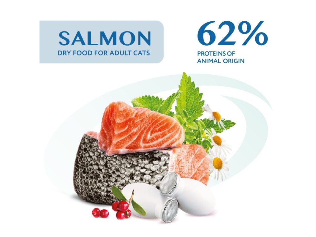 Zlozenie: Dehydrovaný losos 14%, dehydrovaný morčací proteín 14%, zemiakový proteín, ryža, tapiokový škrob, ovos, losos 6%, hydrolyzovaný lososový proteín 6%, kurací tuk, celulóza, repná dužina, minerálne látky, hydrolyzovaný rybí proteín 2,6%, ľanové semienko 1,8%, pivovarské kvasnice, kuracia pečeň hydrolyzovaná suchá, lososový olej, vaječný prášok, koreň čakanky, brusnica 0,2%, uhorkový olej 0,1%, beta-1,3/1,6 -glukány 0,05%, MOS (prebiotikum - mananoligosacharidy) 0,04%, marigolds zdroj luteínu) 0,04 %, koreň lopúcha, koreň althea, kvety harmančeka 0,03 %, žihľava 0,03 %, tymian 0,015 % . Suplementy na 1 kg: vitamín A 15 000 IU, vitamín D3 750 IU, vitamín E 600, vitamín B1 5,94 mg, vitamín B2 4,5 mg, vitamín B6 6 mg, vitamín B12 (kyanokobalamín) 0,16 mg, vitamín K3 1,2 mg, vápnik D- pantotenát 4,8 mg, niacín 42,66 mg, biotín 0,08 mg, kyselina listová 1,1 mg, vitamín C 200 mg, L-karnitín 150 mg, taurín 2100 mg, cholín 2,5 g, meď 2,16 mg, železo 150 mg, mangán jód 3 mg, DL-metionín (technicky čistý) 2 700 mg. Technologické doplnkové látky: antioxidanty prírodného pôvodu 300 mg, tokoferolový extrakt prírodného pôvodu 500 mg. Obsah mastných kyselín: Omega-3 1,07 g (najmä EPA+DHA 0,41 g), Omega-6 3,27 g * 34,48 % kŕmnych bielkovín je rybieho pôvodu, 28,05 % kŕmnych bielkovín živočíšneho pôvodu